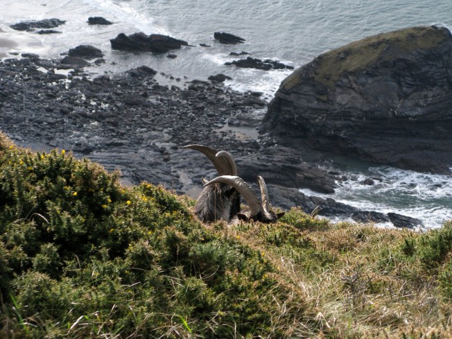 Climbing into the bracken and prickly gorse bushes, I saw something curvy sticking up that looked like a horn of unusual size for animals found in the fields here where we’ve walked. (Can you see it? ) Right … well I barely could, so deeper down the side of the hill ( mountain cliff ) I went until I was able to see a bit more. I will be back a little later today to show you what I saw.