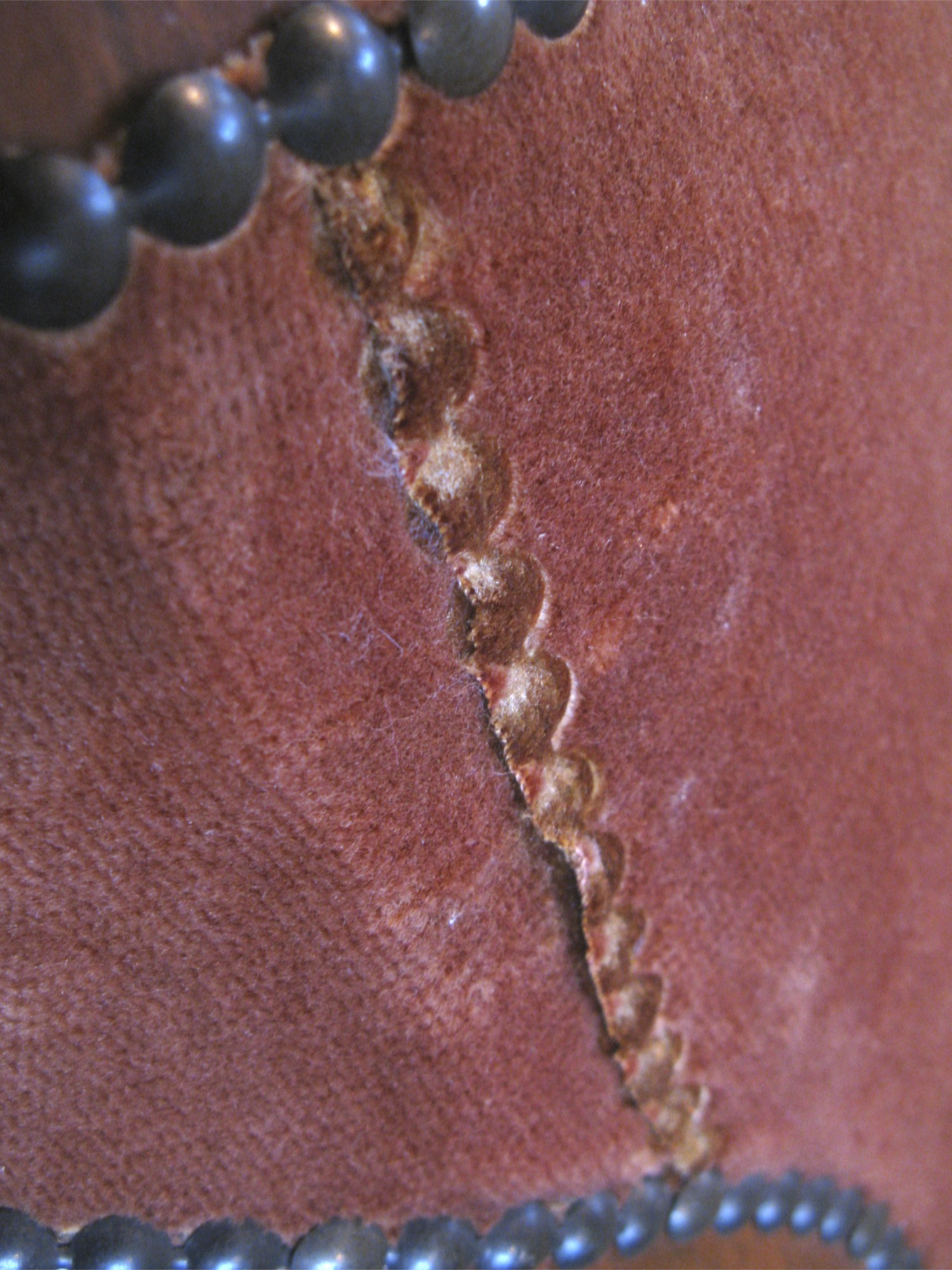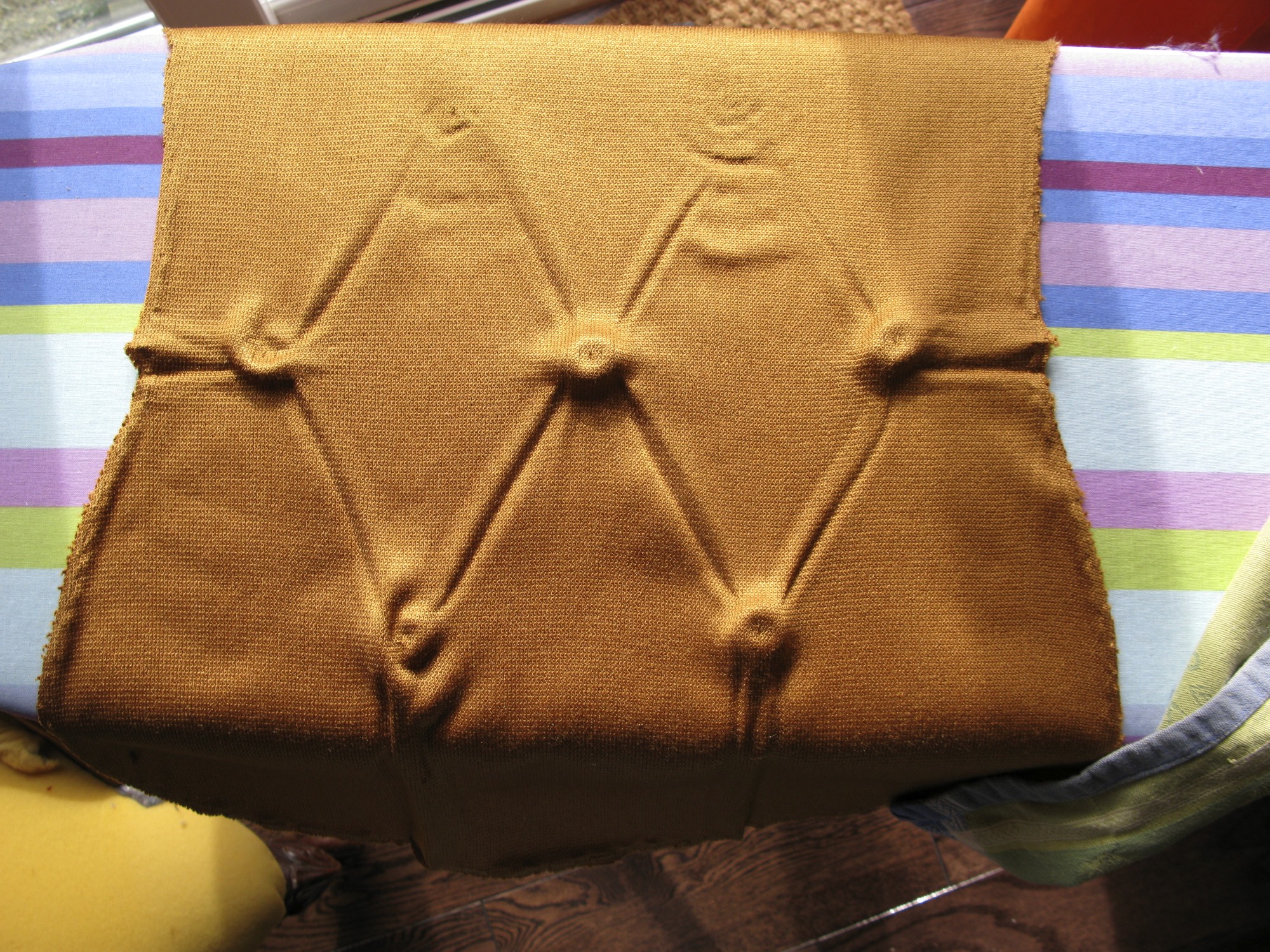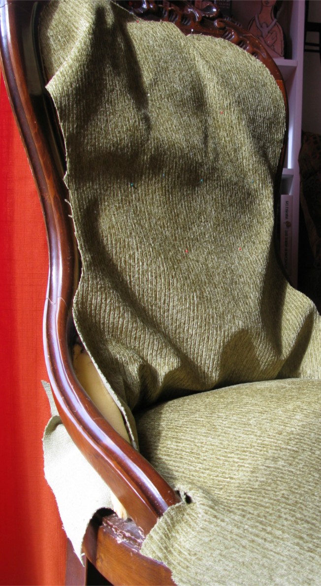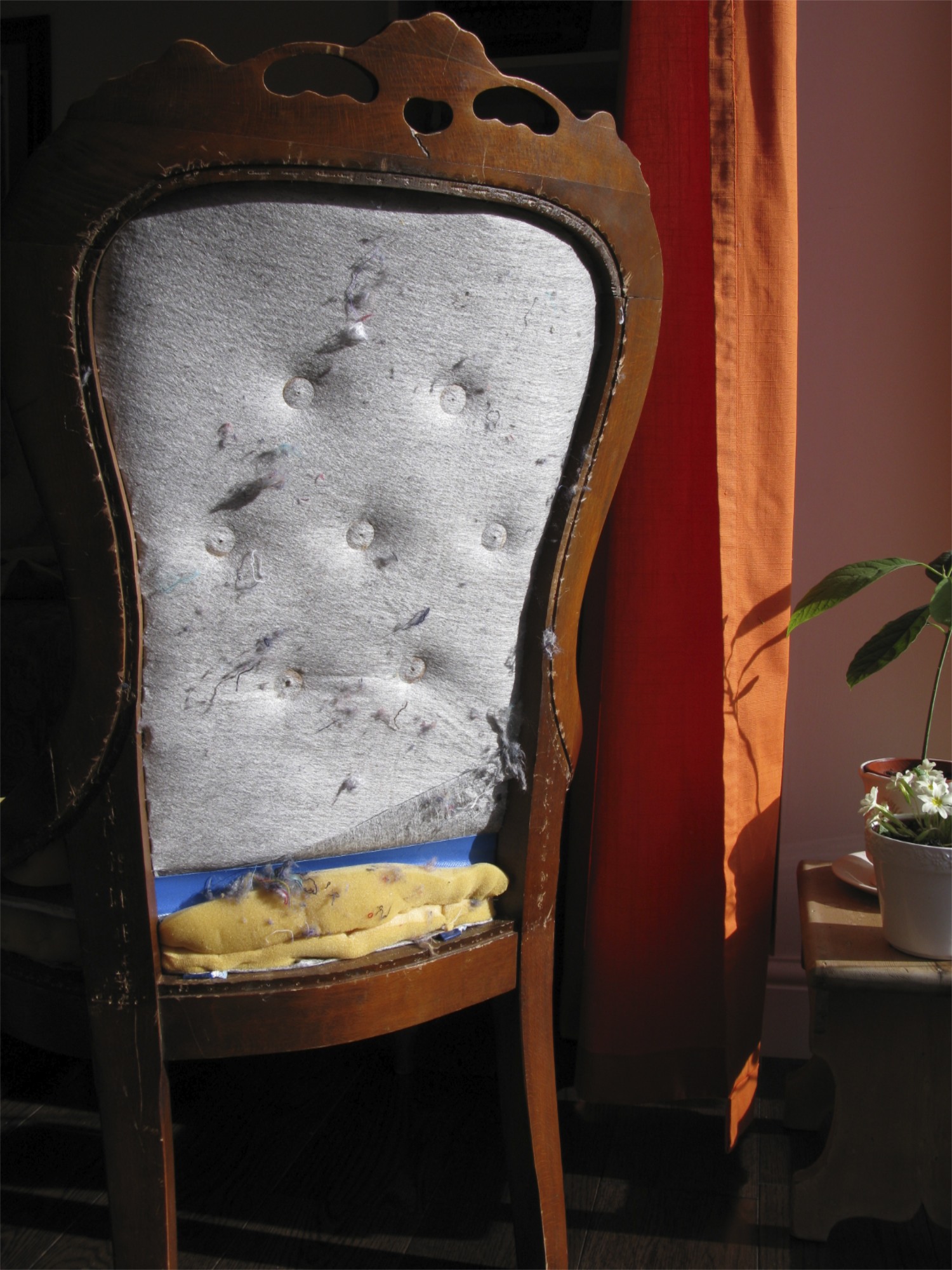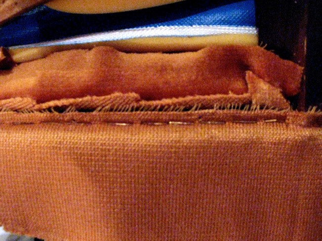 Here you can see the padding underneath waiting for its new covering. It still retained the previous shape and I was careful not to damage it when I was taking off the rusty-orange colored original fabric.