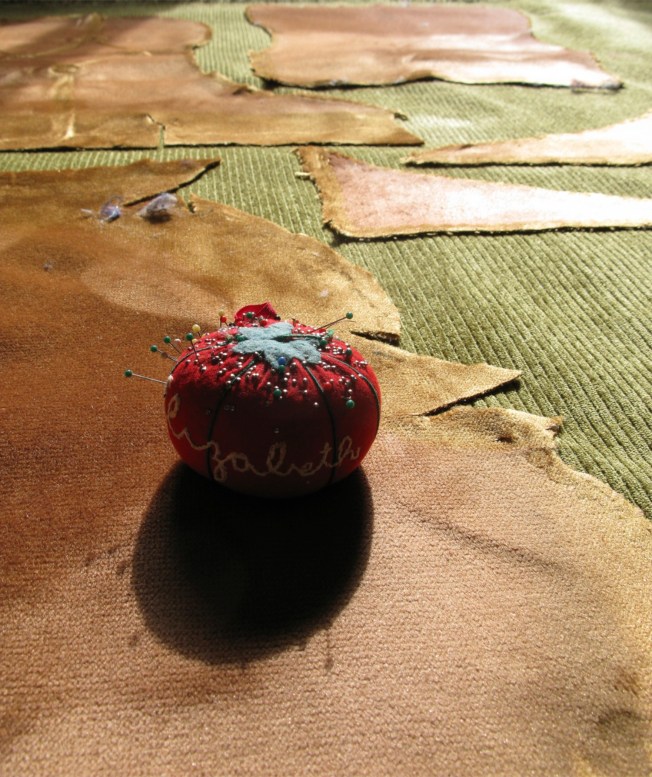 After taking it all apart, I laid the pieces of fabric out to use as a pattern placing it on top of my green piece. A quick look told me that in order to get a proper cut to my fabric, the pieces I was using as a pattern needed a touch of the iron.