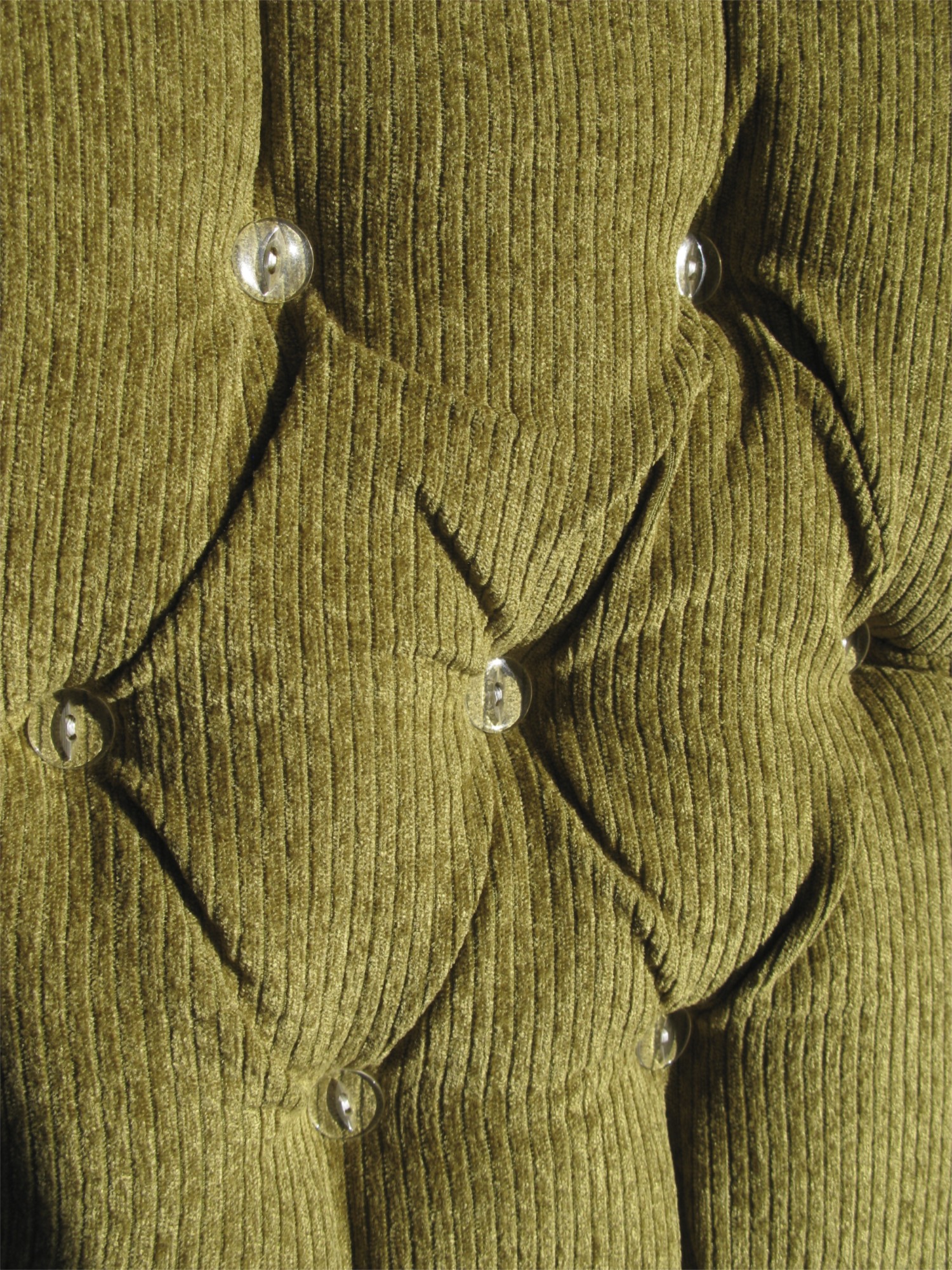 This is a close-up of the buttons and tufting. The clear buttons show green through them which I really like.