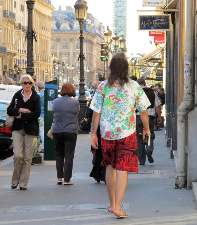 I happened to catch sight of the serious fashion faux pas above while walking down a side street near the Paris Opera House where the fashion greats have had models strutting their stuff during Fashion Week. I’m willing to bet that no one invited this guy to attend any of the events.