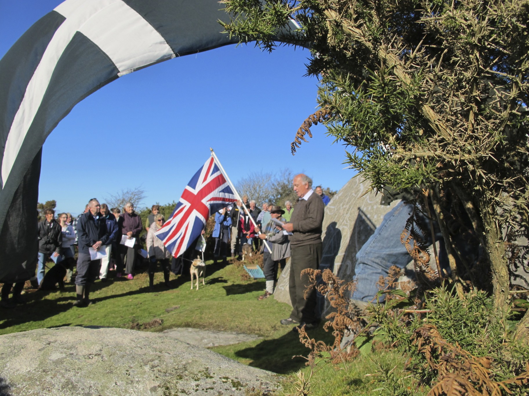 I snapped off a couple of shots before deciding at the last minute that I wanted have a place in the local history of my new home and shouted out, ” Is it too late for me to be in the picture? ” I quickly took my place near my friend Tina on the other side of the flag of Cornwall, the black and white St Piran’s flag.