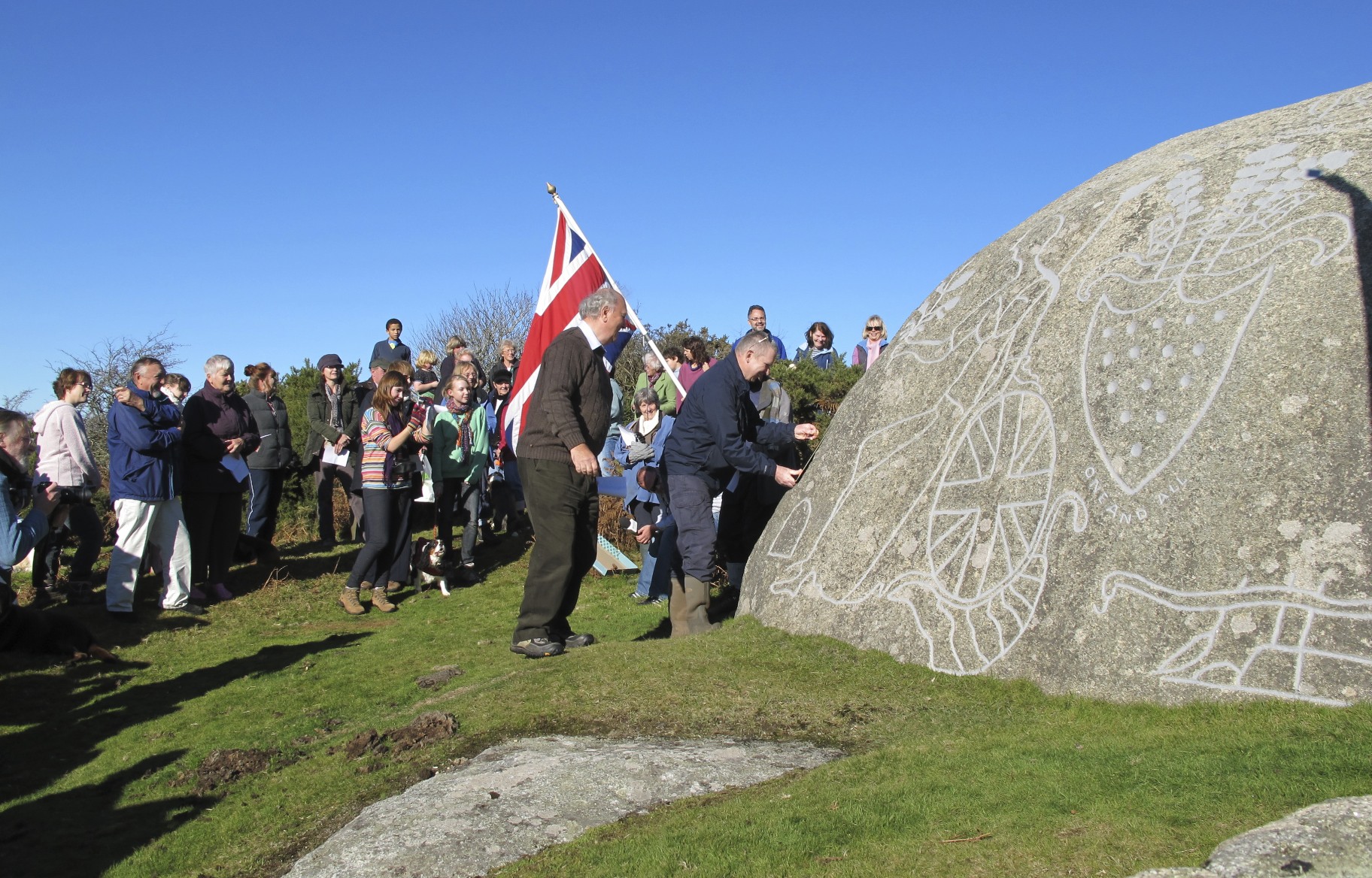 ” The massive 8 foot high granite boulder was said to have been carved by Lt. John Rogers to celebrate the 1810 golden jubilee of King George III. All is apparently original except for an 1897 addition for Victoria’s golden jubilee.  Detail includes Britannia, the Royal and Cornish coats of arms and those of local families, a plough, and two mason’s marks, a compass and square.”
