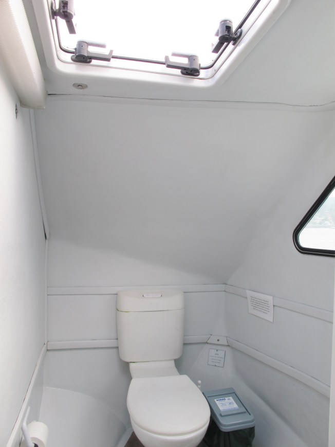 Three guesses where I was when the boat slowed and the hatch opened? Do you see the skylight opening above the toilet … when people climb up those steps and stand on the walkway they are right over the skylight and able to look down into the ladies toilet.