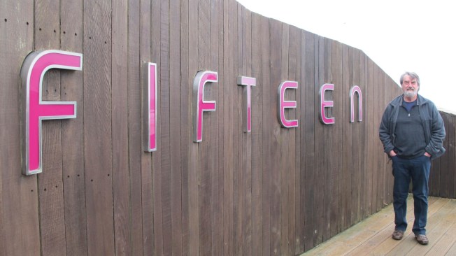 John got this picture of me with Fifteen in the background. Our table was about midway down the upper level of windows. I think I was photographing the family with children in this shot.