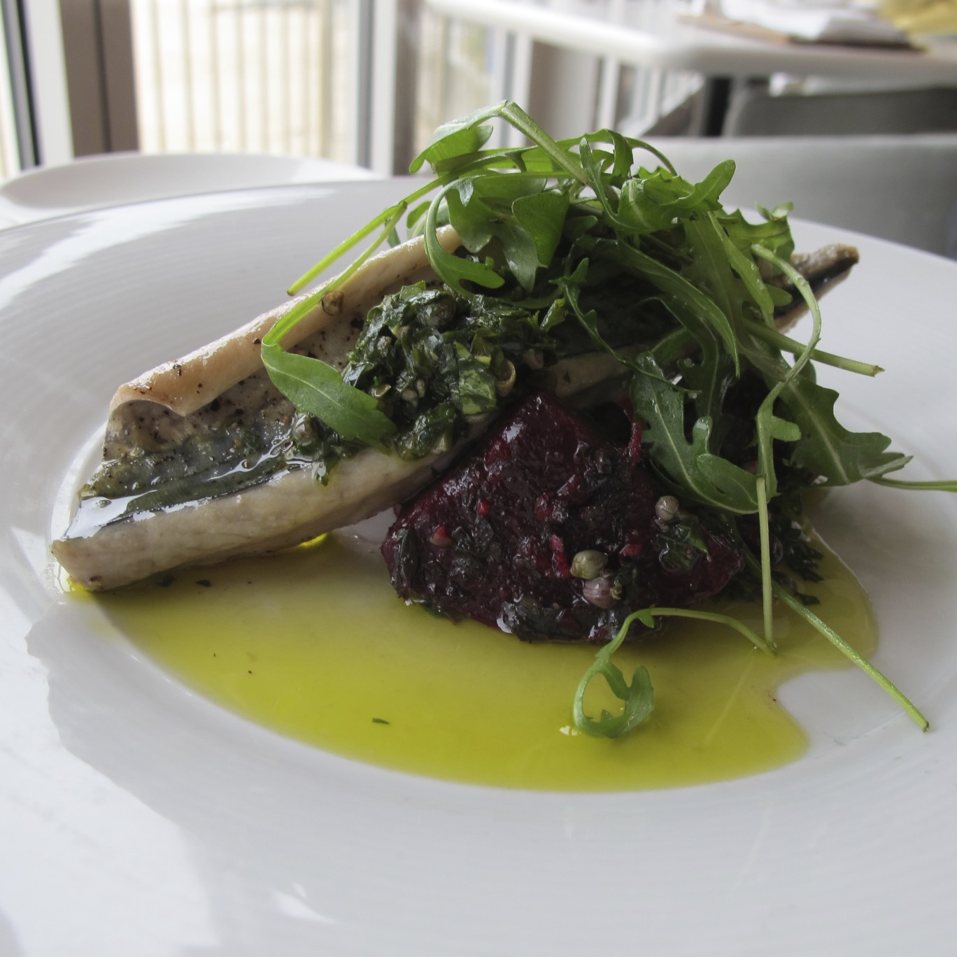 John tried to get a photograph of our waiter/server, Nick so I could put it here with my review of his service. He was fabulous and I would recommend if you book a table at Fifteen in Cornwall, ask for Nick. Not only was he fast as you can see by his blurred image above, he was very food knowledgeable and a surf instructor too.