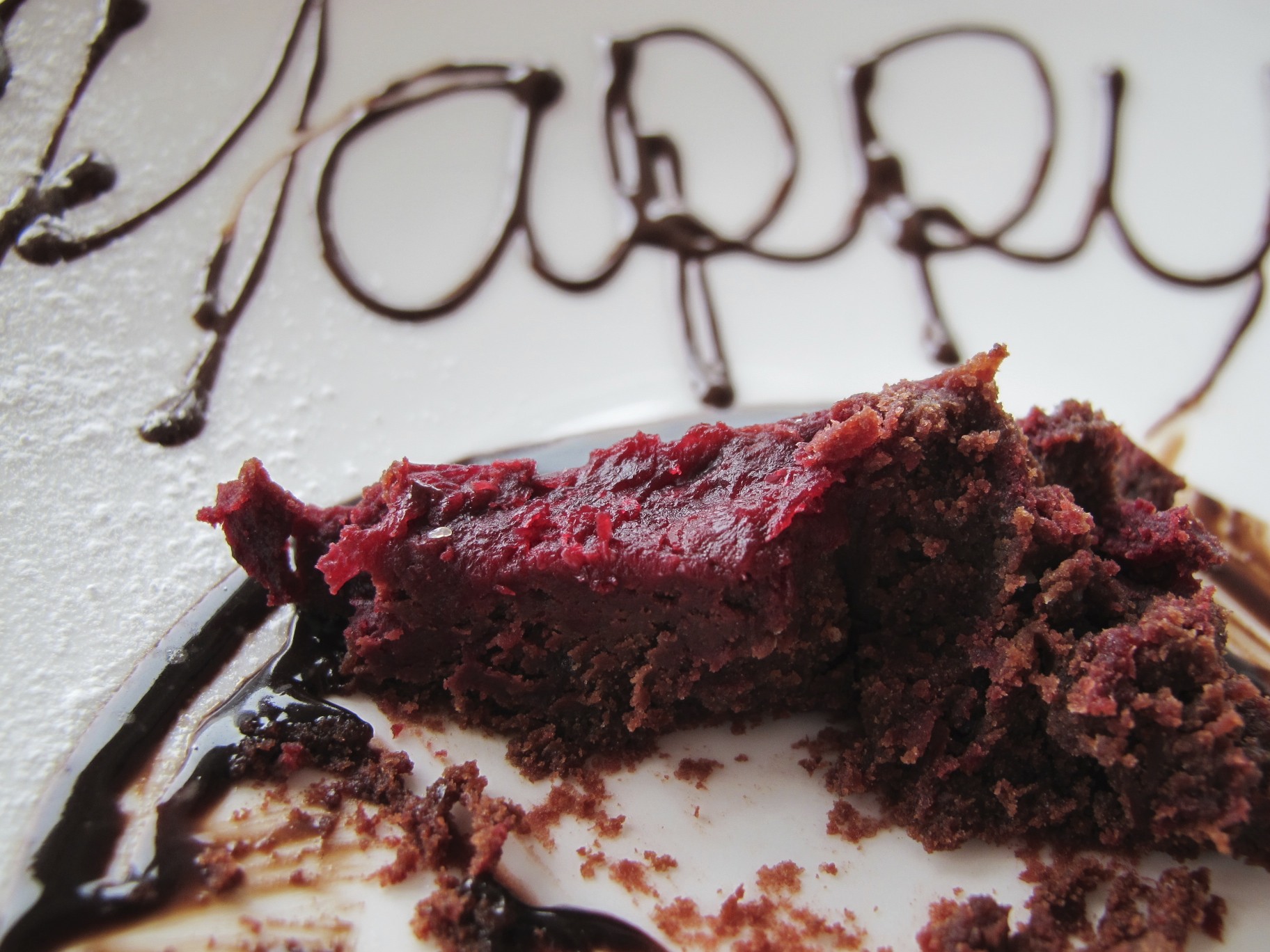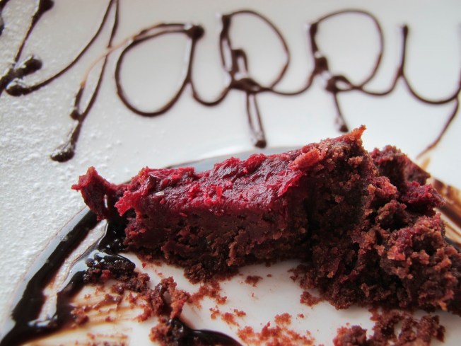 You are looking at a yummy dessert John and I ordered. It is chocolate cake obviously, but what it not so obvious is that it has beets in it. See the red layer … it’s what they call beet root here.