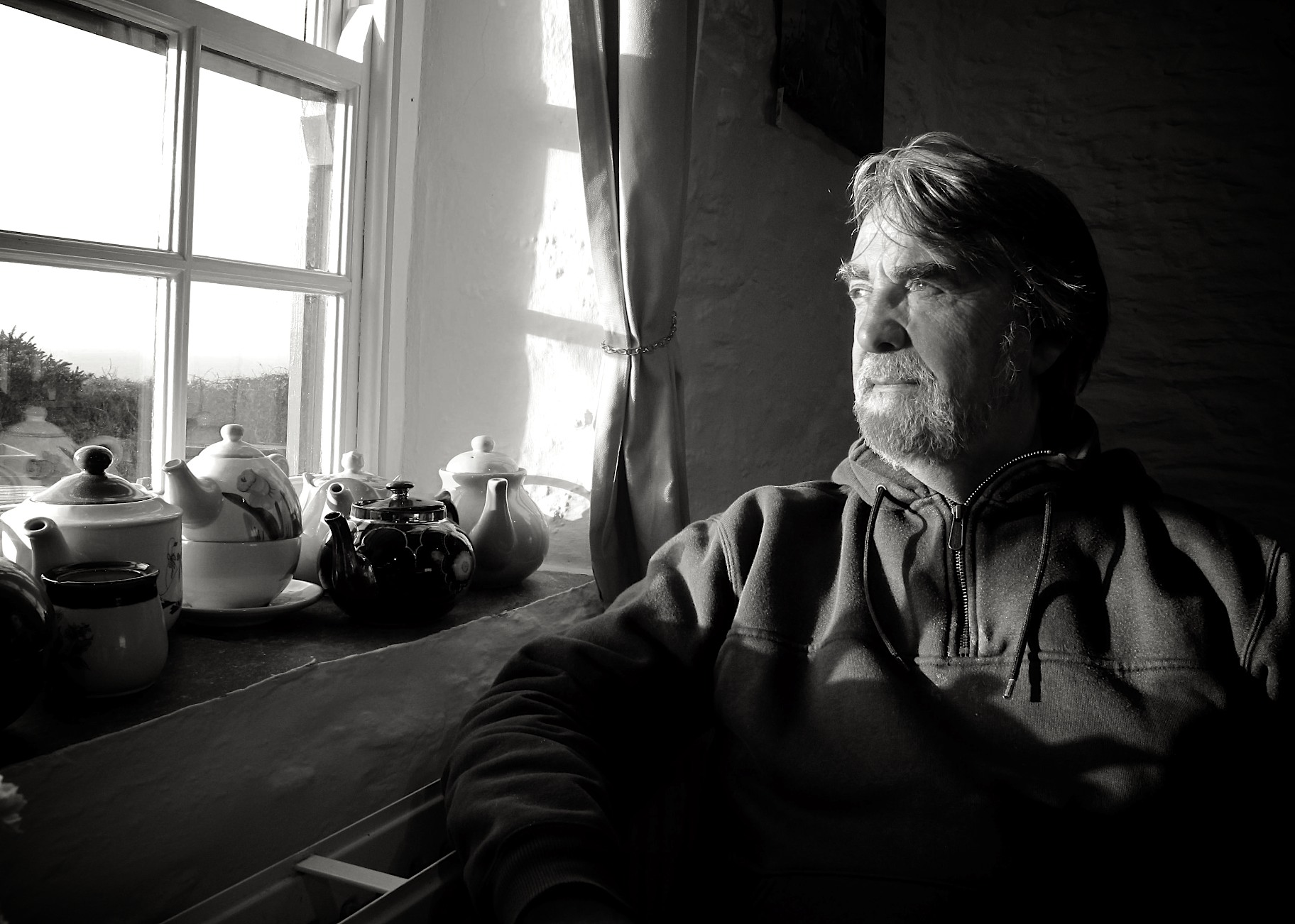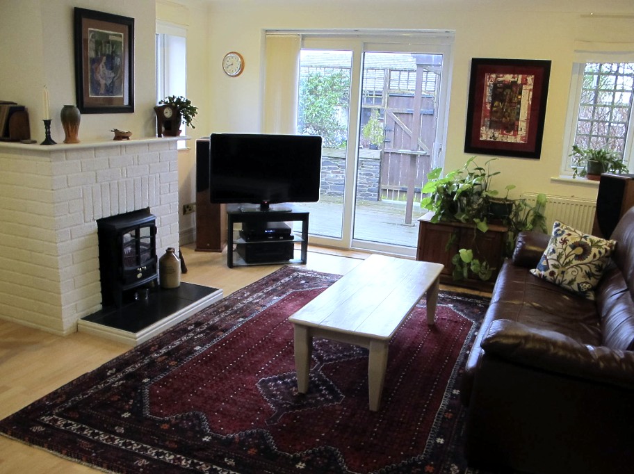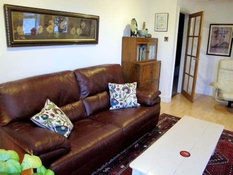 The coffee table is not as bright white as it looks here and it usually has something on it such as flowers or a plant. John made it 42 years ago mostly from driftwood he picked up on the beach in Ireland. I like how it provides some lightness with so much dark furniture and the pillows help as well.
