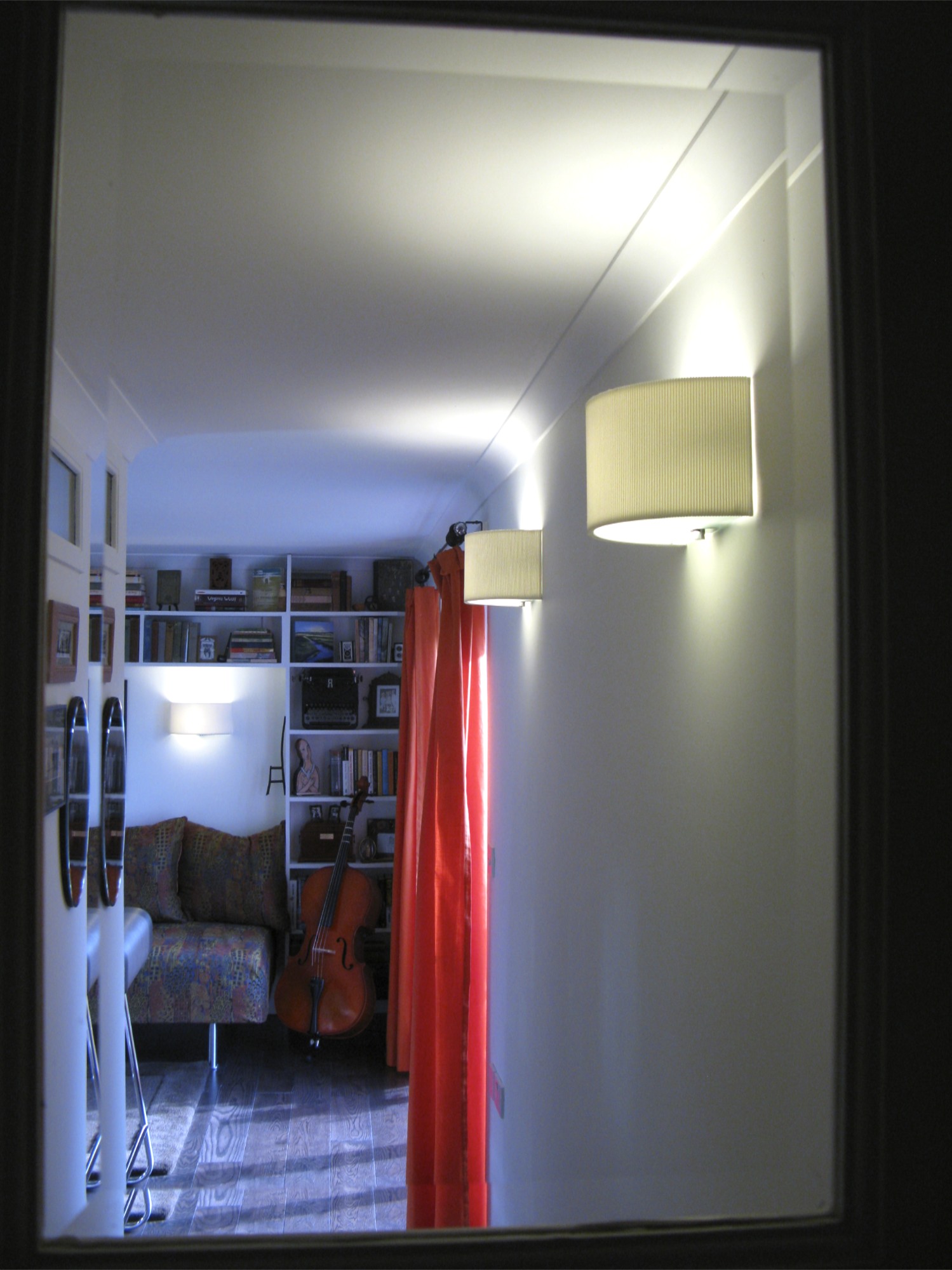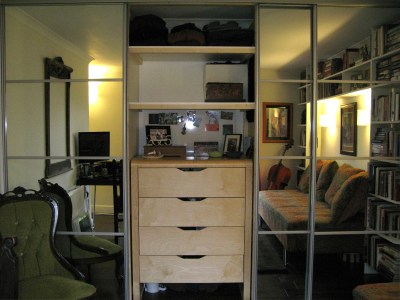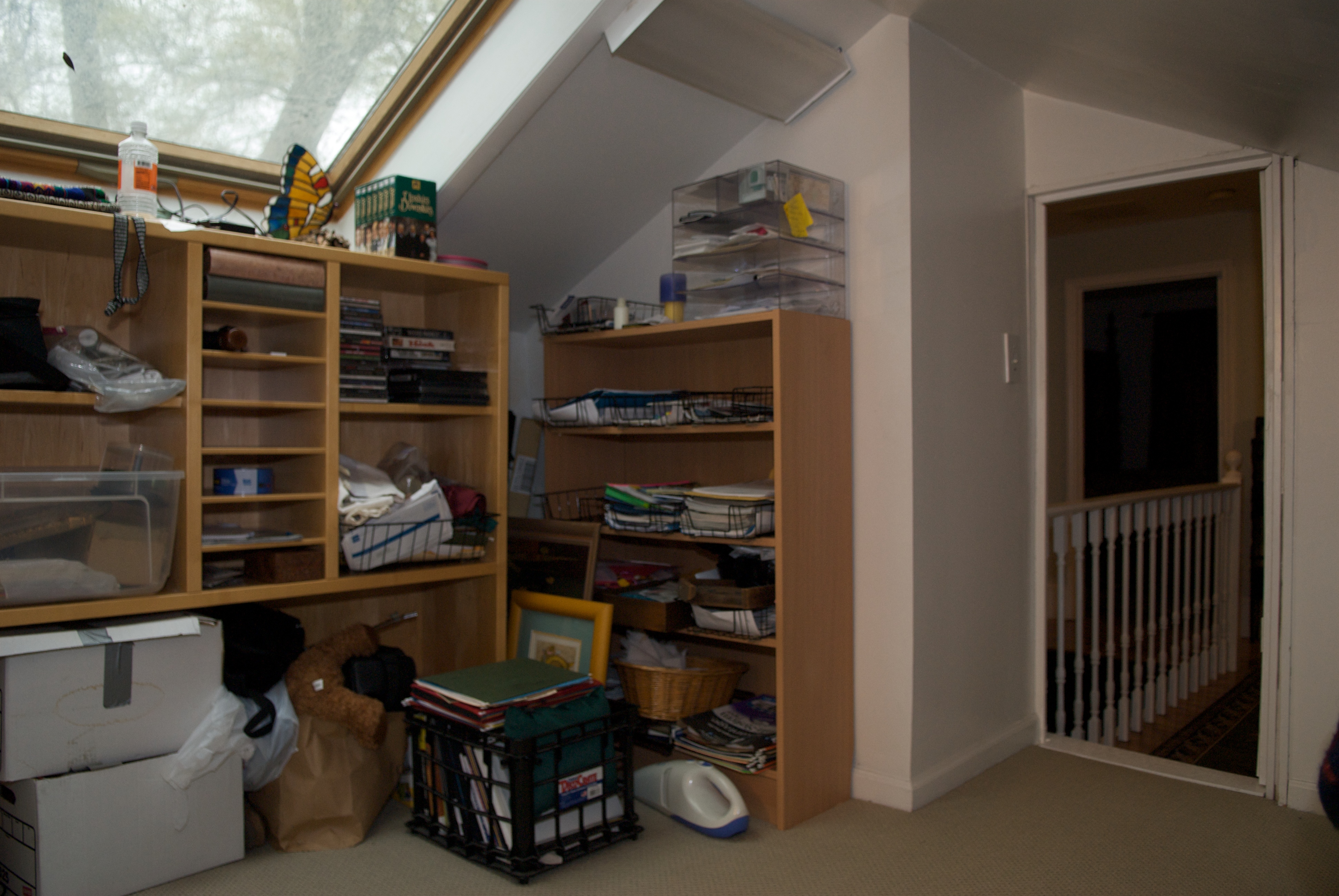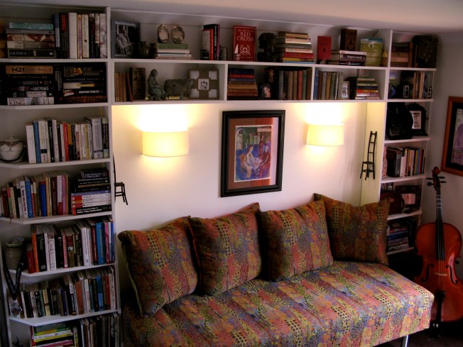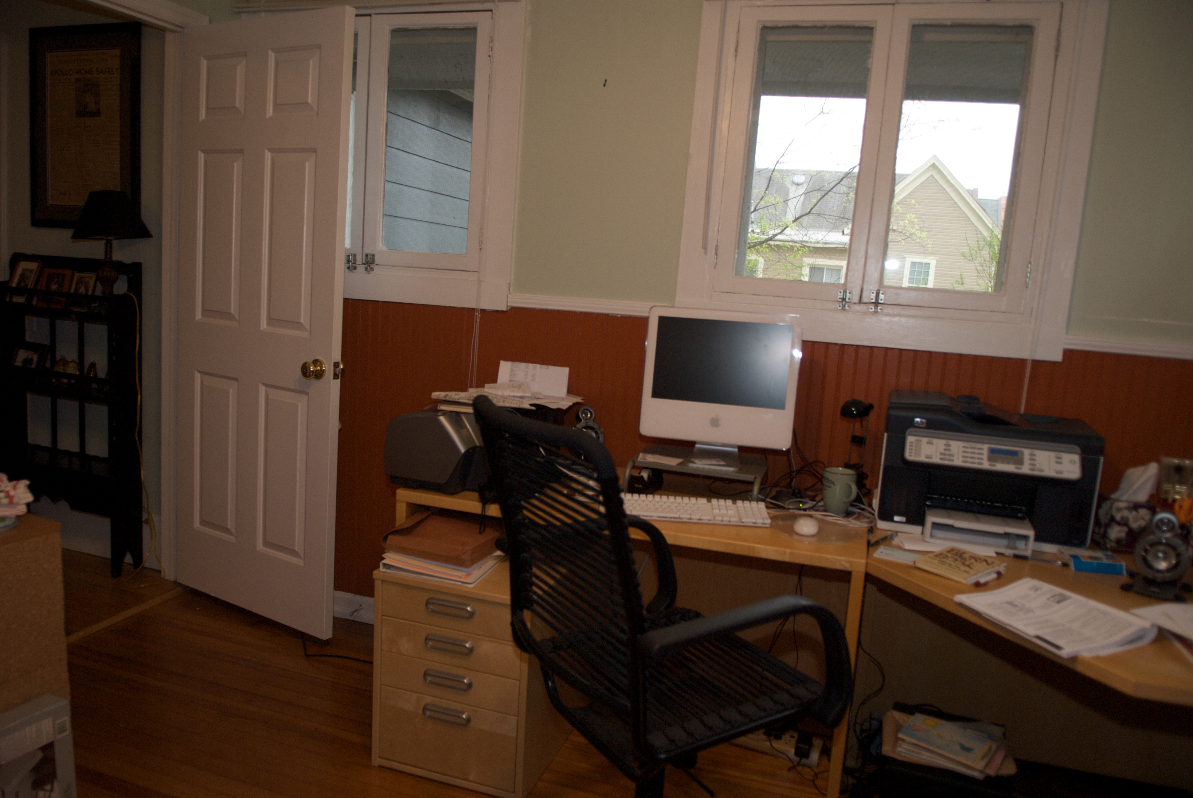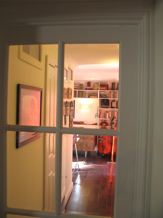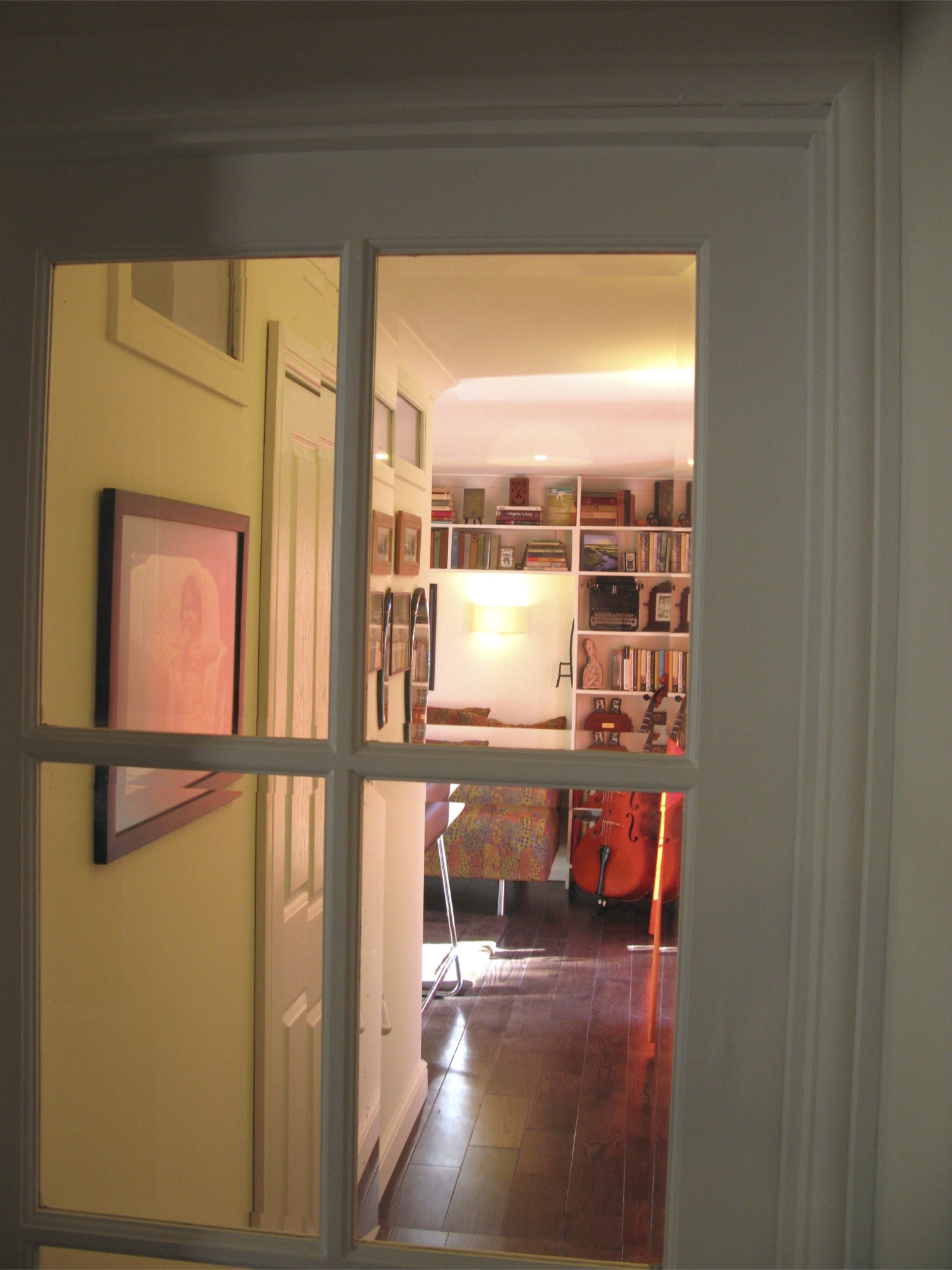 Here’s a last look before the wall came down. After John built the extension so I might have a room of my own to write, the configuration of the house changed making it unnecessary for the entry door you can see in the photo below. Before building what he jokingly refers to as the East Wing, that door opened into the master bedroom. After the addition of a hallway, my studio space, and two bathrooms, it became possible to take down the corner wall and open up the room a bit more.