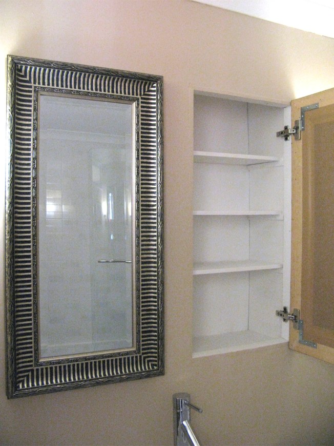 You may notice that we have not settled on a decision for the backsplash. John likes it as it is, but we tend to be messy and I think we’ll need at least a sheet of glass or acrylic to cover the green part up to the molding he installed. He also turned an unused space into a cookie sheet storage area by hinging the small wooden strip below the oven and adding a pull.
