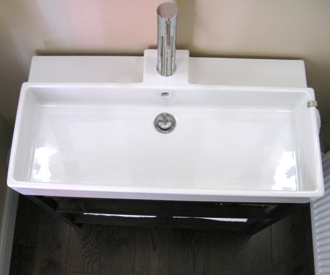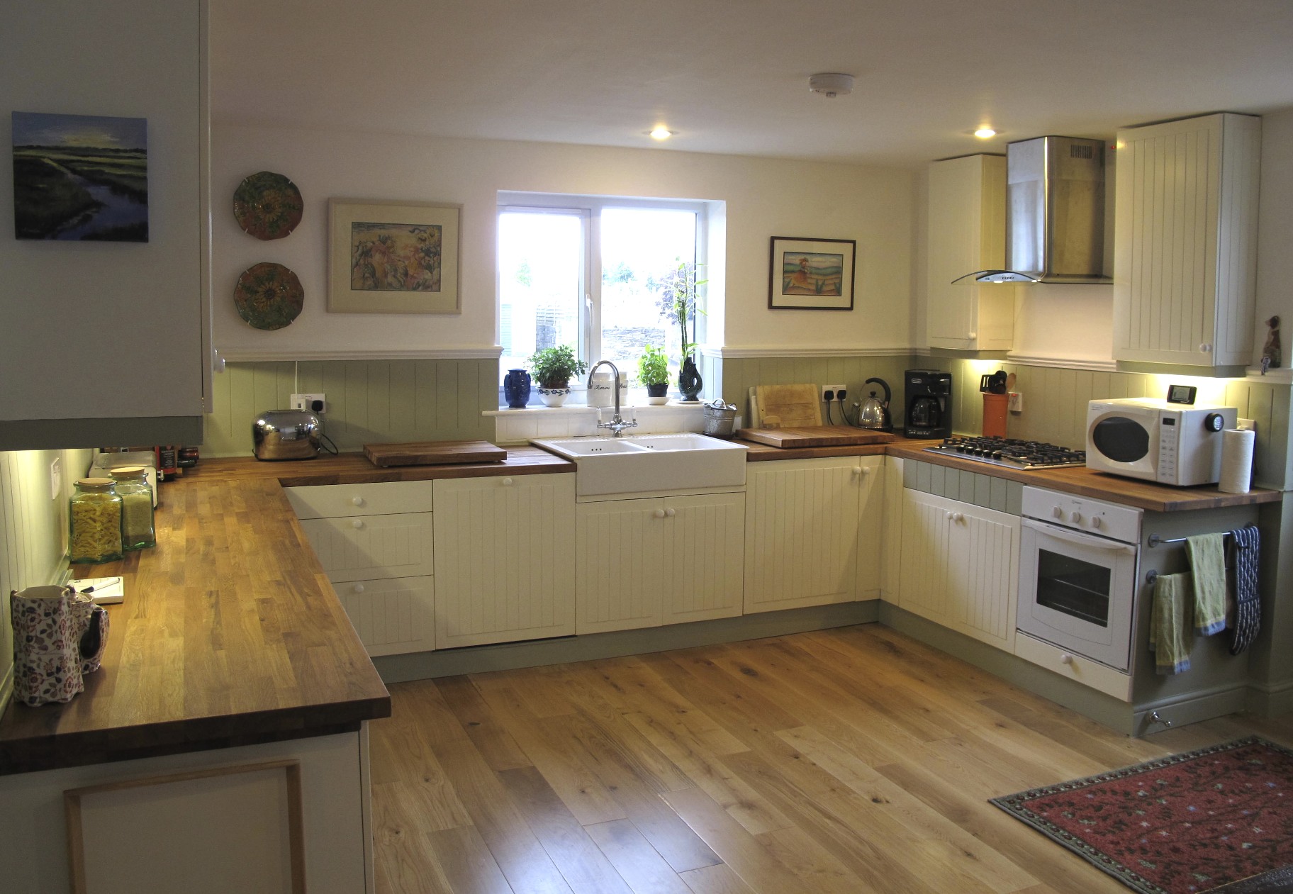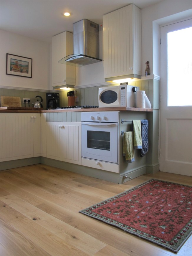John built the new cabinets in the photo above using old materials to create units that were more shallow than the ones there before. He replaced the laminate floors with hardwood and I found a smaller entry rug for the door in the things I brought over in 2009. We think it’s a good match. Everything had a fresh coat of paint and the cooker hood or range hood as I’d call it is one that John found online. It works so much better than the old one making me especially happy when John cooks fish.