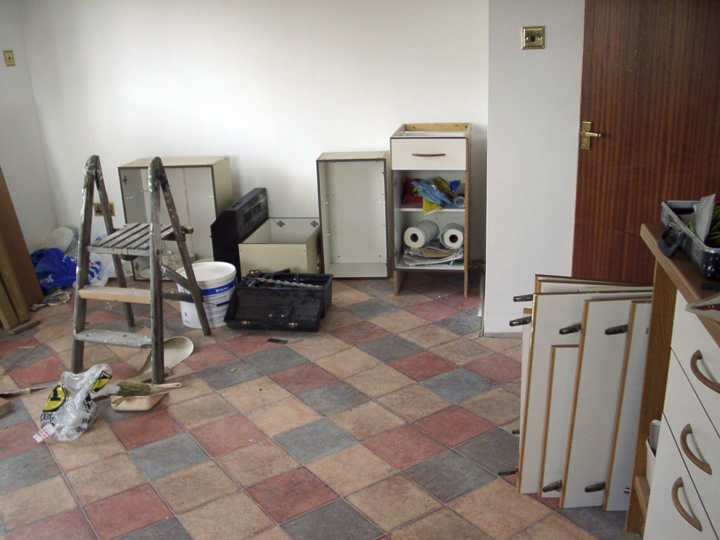 Here you see the cabinets going in. John bought the cabinet doors from Ikea and built the rest of it from big sheets of furniture board because it was as he said, “less expensive than ready-made and more flexible.” The countertops are the old ones from 1997 just before John tiled them black like you see in the photo below. He believes in reusing materials when possible.