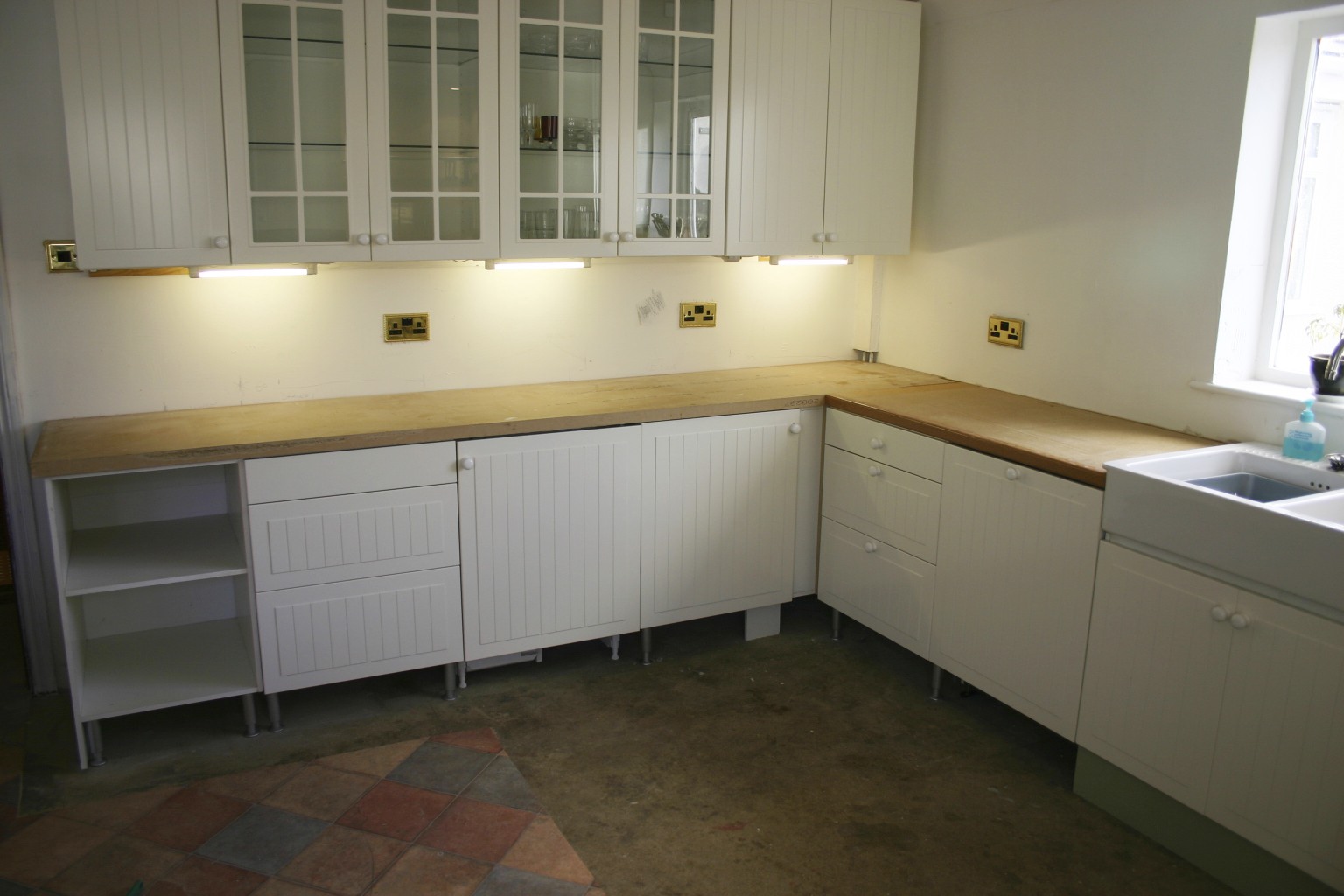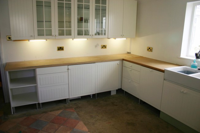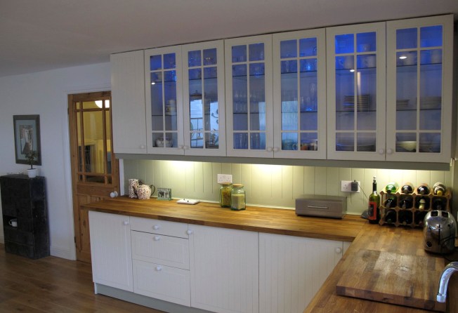 The second kitchen redo was much smaller, taking place in 2009 when my things arrived from the US. John added more glass fronted cabinets for my china and other glassware along with another solid cabinet on the left side of the window over the sink.