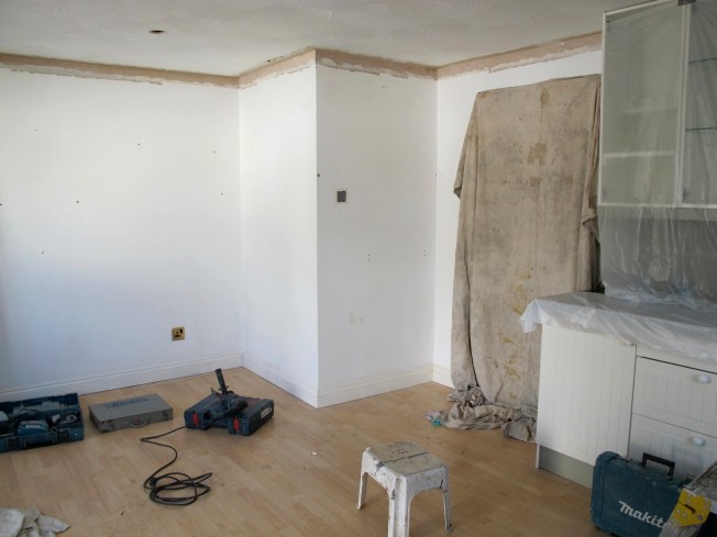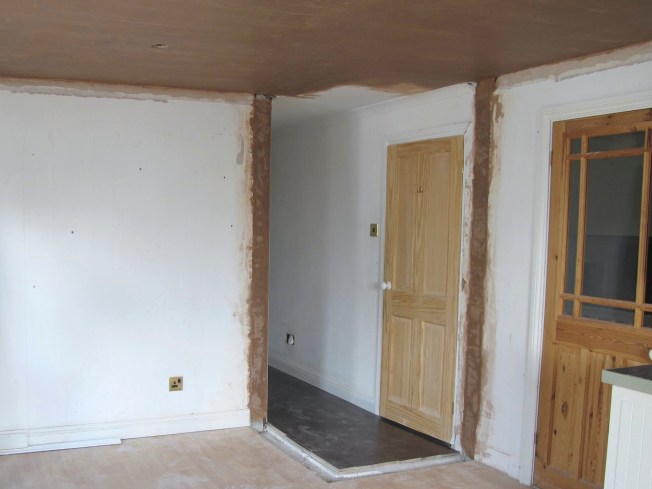 The out-dated Artex ceiling went too, along with the door leading from the main hall into the East Wing hallway. Then he pulled up the small bit of dark wood that had been part of the hallway floor and took out the door you see on the right. He fixed the wall afterwards and then put a new door and partial wall in where the hallway begins. The ceiling is dark in this shot because the plaster was still drying.