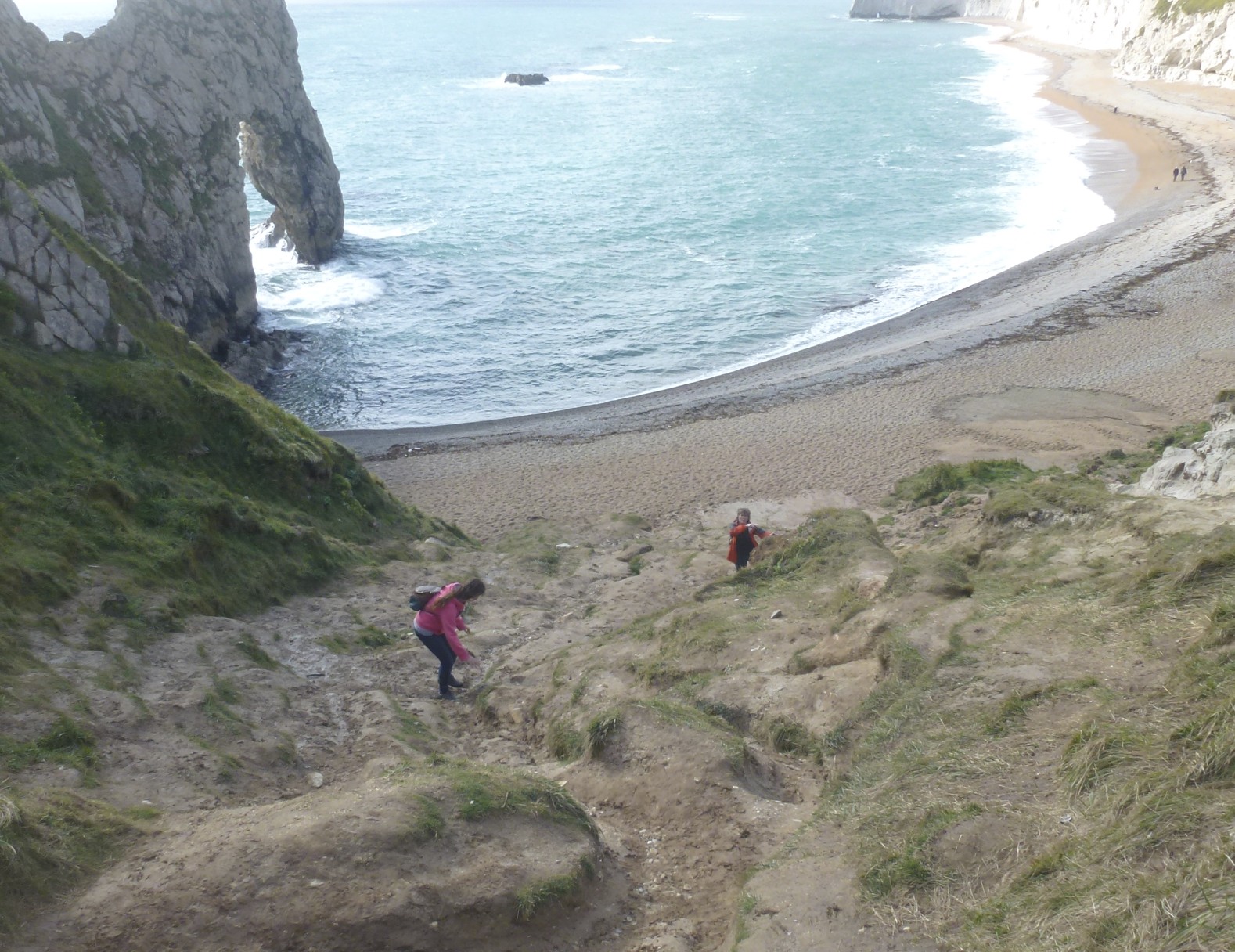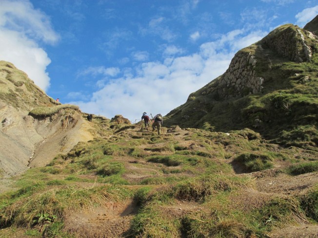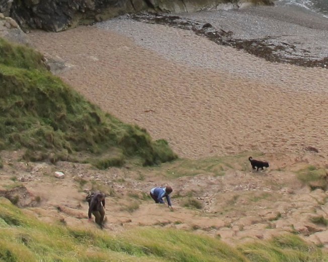 I asked Cathy’s permission before posting these two photos of her. I thought they were too cute not to so I’m glad she was a good sport. She was not expecting to be slip sliding up and down the coast so her boots were not the best on the muddy path and she had to do a balancing act to get up the hill near Lantic Bay. I like her technique.