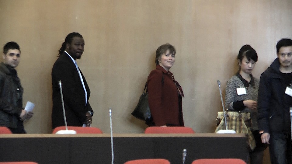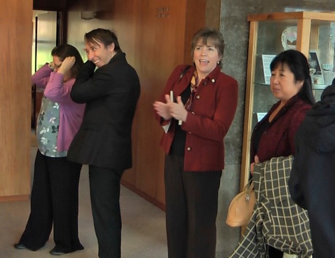 Cornwall Council ChamberThe ceremony took place in the council chamber. You can see me talking with an American woman in a hat who also became a Brit and my friend,  Armella Jenkins who happened to be in the UK and came down from Devon to share the experience. She’s the woman to my right.