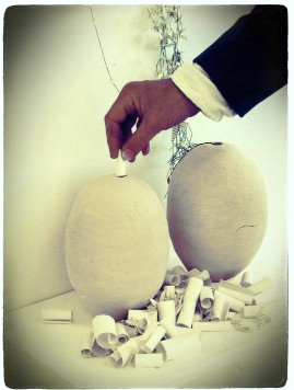 We were encouraged to write a burden we wished to be rid of in 2012 on a slip of paper and drop it into the vessel on the right and if there a secret something we hoped for in the new year to write it on another paper and put it into the left container.