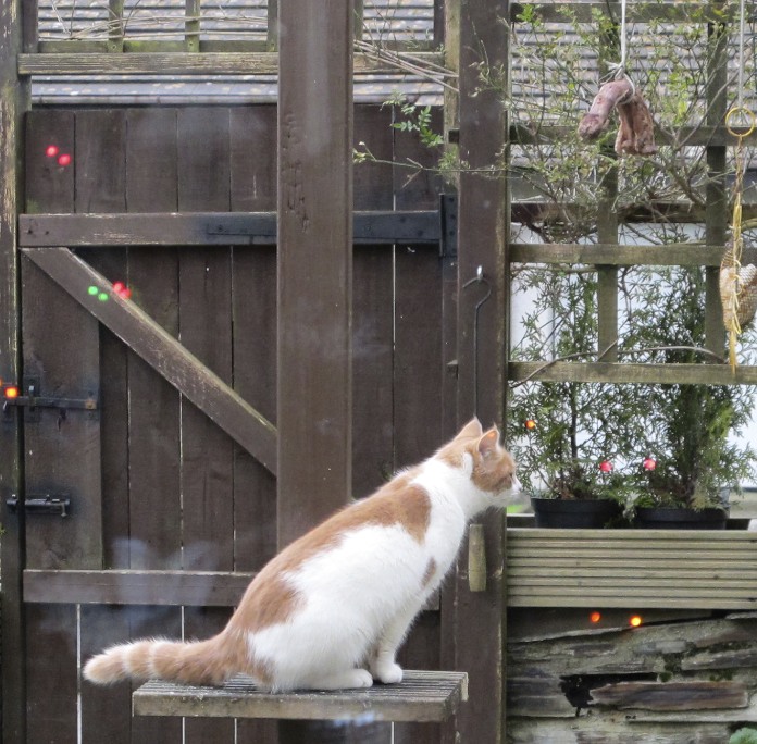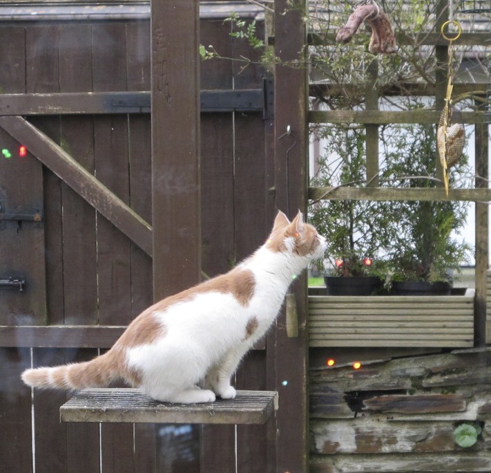 Alfie, is a neighbor’s cat who comes over almost daily to have his ears scratched and to see what food he can scrounge. At Christmas he found his way up to the temporary bird table John built to feed the birds over the winter after an older one fell apart.