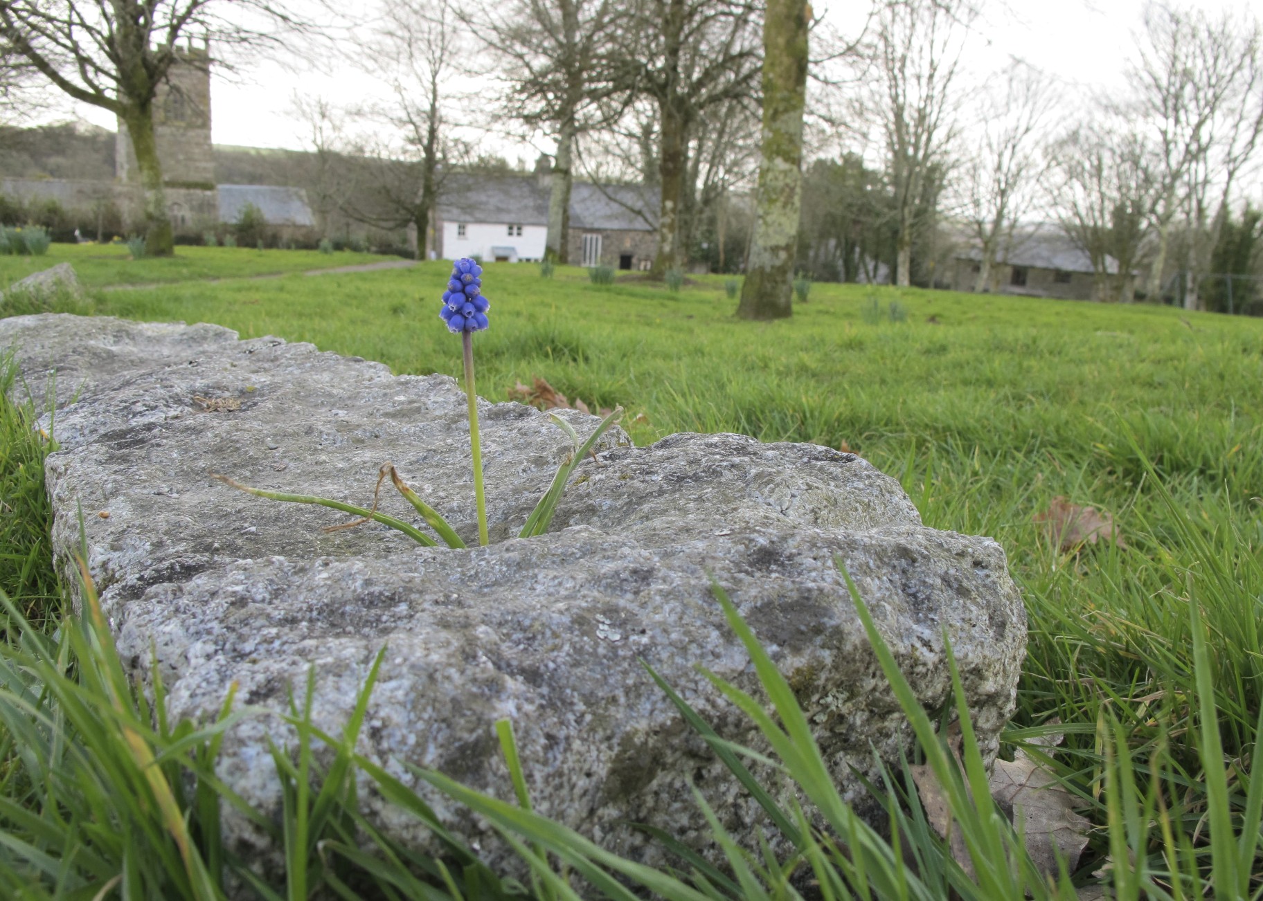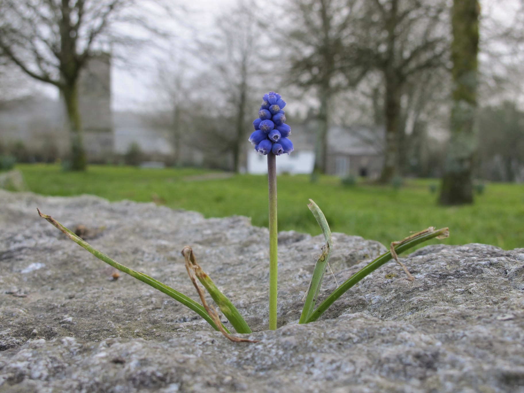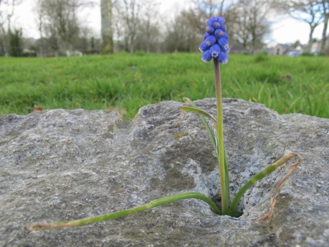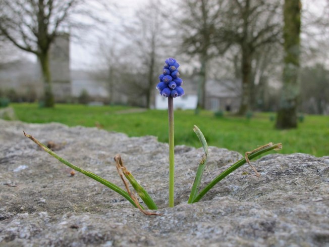 I wanted to share a couple of photos of a lone Grape Hyacinth that stayed with me this week during my gloominess. I found it intriguing that it appeared to be growing out of the rock.