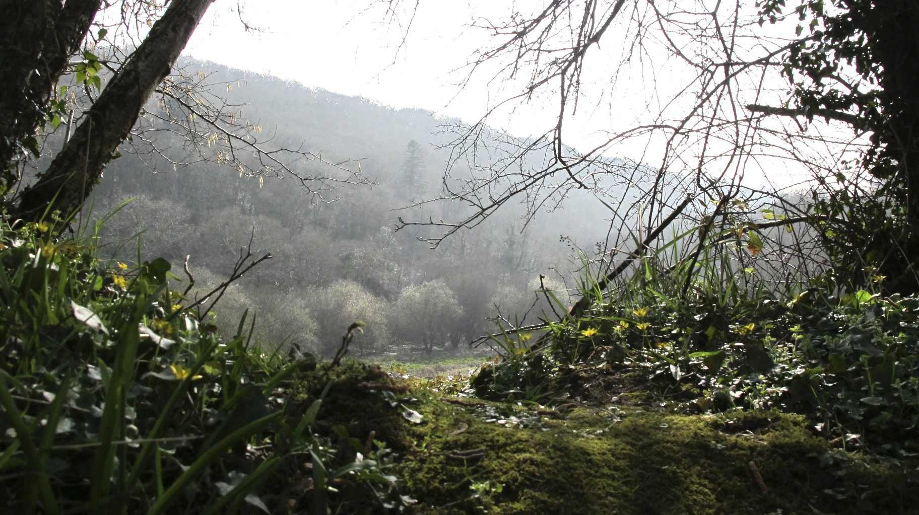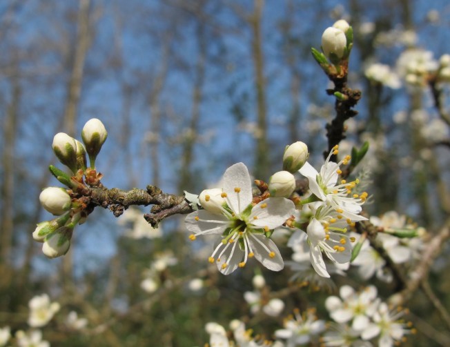 This is just a peek over a hedge at the trees below waiting to shake off the last bits of their winter look.