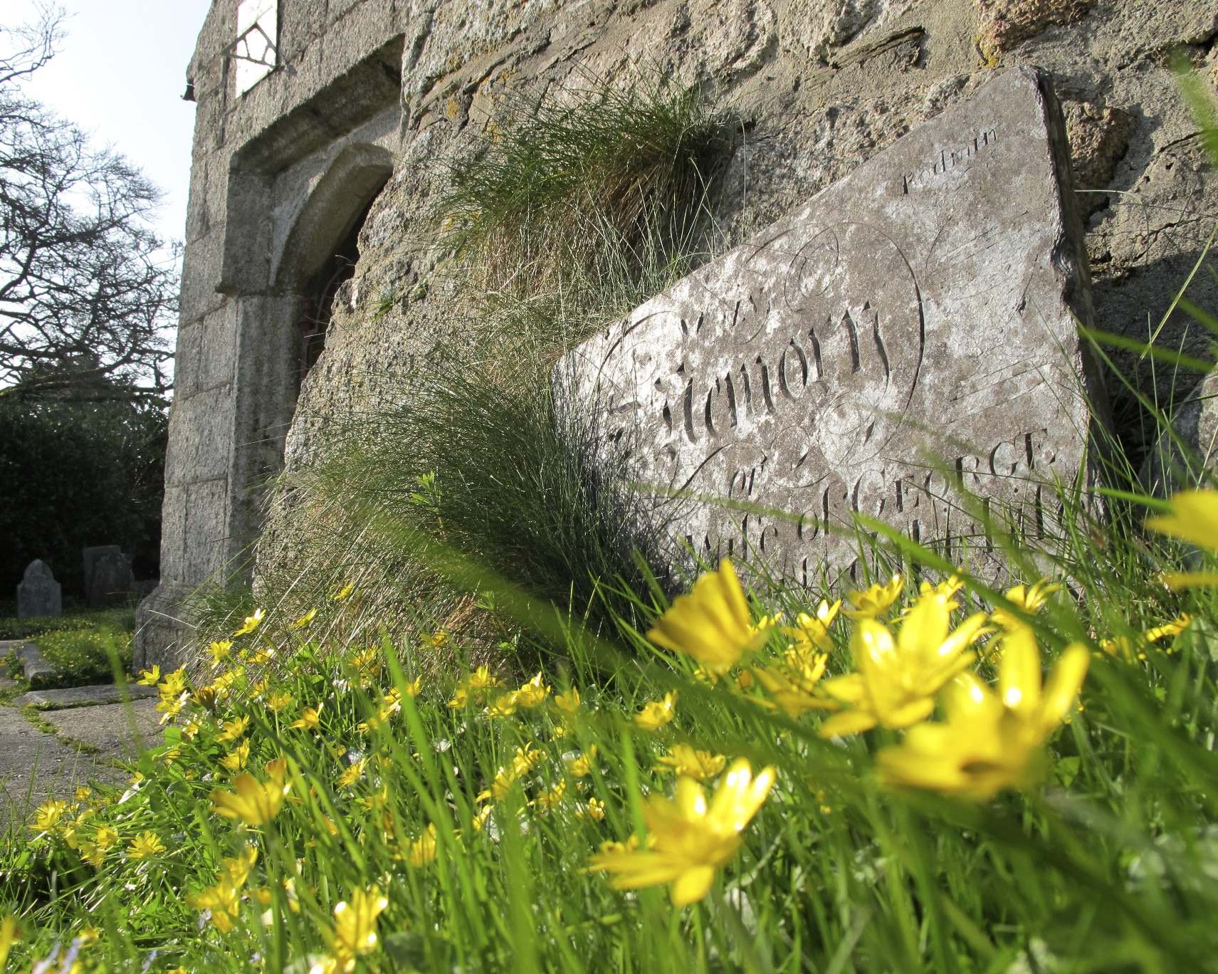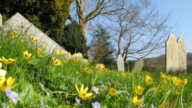 Yellow flowers fill the churchyard for now, but soon they’ll be competing for a bit of grassy space with the many-colored primroses that come every spring. If you look above the church door in the top left of the photo, you can see a sundial near the arch.